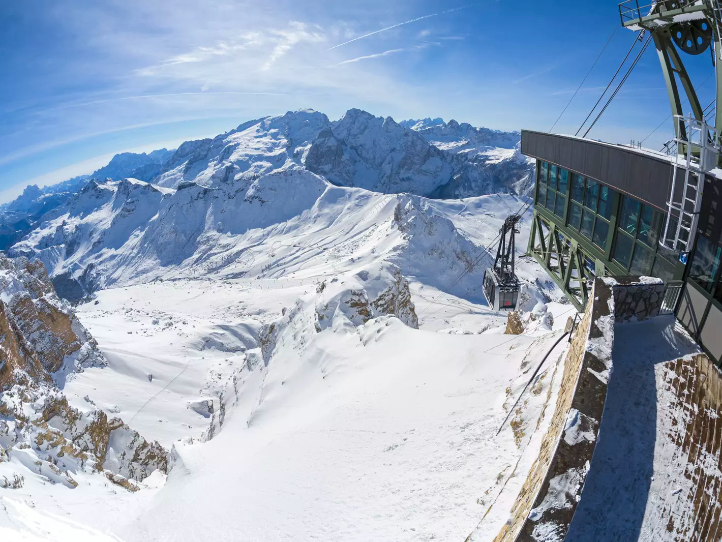 Skiing on the Marmolada is not to be missed - from Arabba it takes around 40 mins skiing to the base cable car and then a further 2 cable cars to get to the top. The best known run is the Bellunese from Punta Rocca at 3300m down to Malga Ciapela, a vertical drop of 1800m and 12km long - truly amazing and stunning scenery all the way.