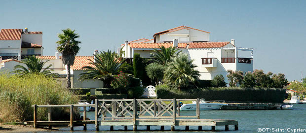 Holidays in Saint Cyprien - close to the Spanish border and backing on to the Canigou massif, Saint Cyprien is in the Pyrénées-Orientales province of the Languedoc Roussillon region of France. A lively all year round port and resort and very popular with European tourists.